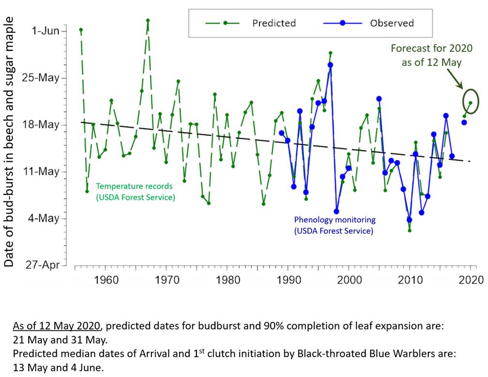Based on our current best phenology models (after Lany et al. 2015), temperatures to date this year, and the 10-day forecast as of 5 May 2020, predictions for budburst on the Main bird plot (490 m asl) are: