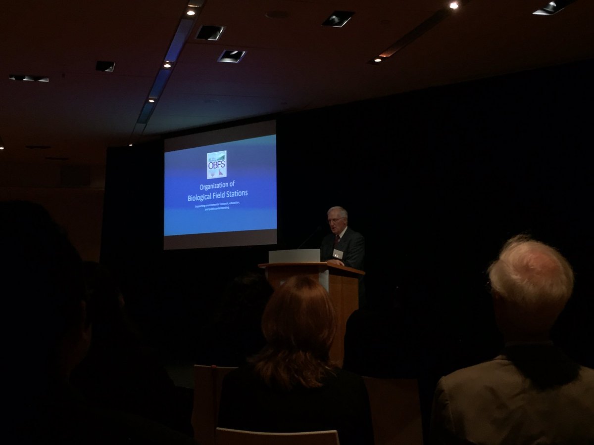 During the event, Dr. Gene Likens received the Organization of Biological Field Stations Award for Distinguished Service to Field Science by OBFS President Paul Foster. In his acceptance speech, Likens emphasized field stations ignite a lifelong spark of discovery in young people. He conducted research on pH, nitrogen and other environmental variables at Hubbard Brook Experimental Forest and ESF's Huntington Wildlife Forest among other sites. Studies by Likens and colleagues led to the discovery of acid rain, ultimately resulting in landmark national policy via amendments to the Clean Air Act of 1990 and improvements in air and water quality across the northeastern United States.